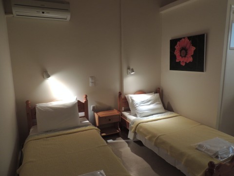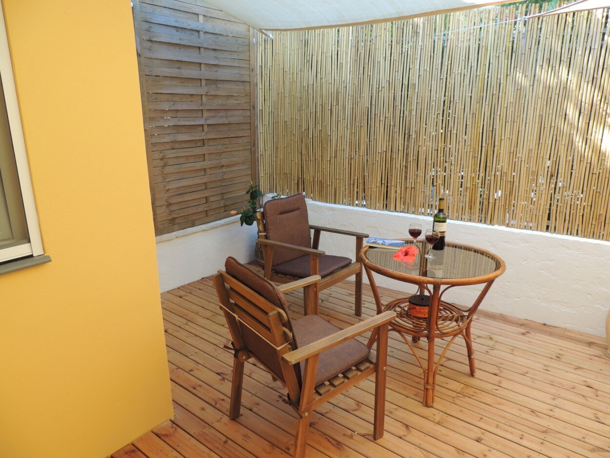 "Fofo" on compact 17sqm provides everything a person or a couple needs on holiday. This studio has two single beds, wardrobe, dressing table, bedside table and a kitchenette with all utensils for breakfast or a simple meal. You can sit inside on a small folding table or in front of the balcony and at the rear new designed a bigger veranda which is framed from the neighbours by oleander bushes. In summer a sun-sail spends shadow.
