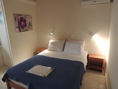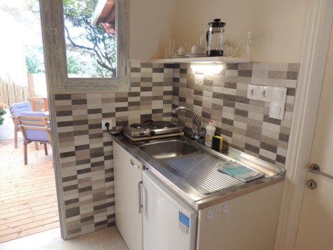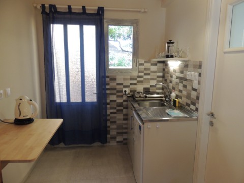 "Kosta" on compact 17sqm provides everything a person or a couple needs on holyday. This studio has a double bed, wardrobe, dressing table, bedside table and a kitchenette with all utensils for breakfast or a simple meal.