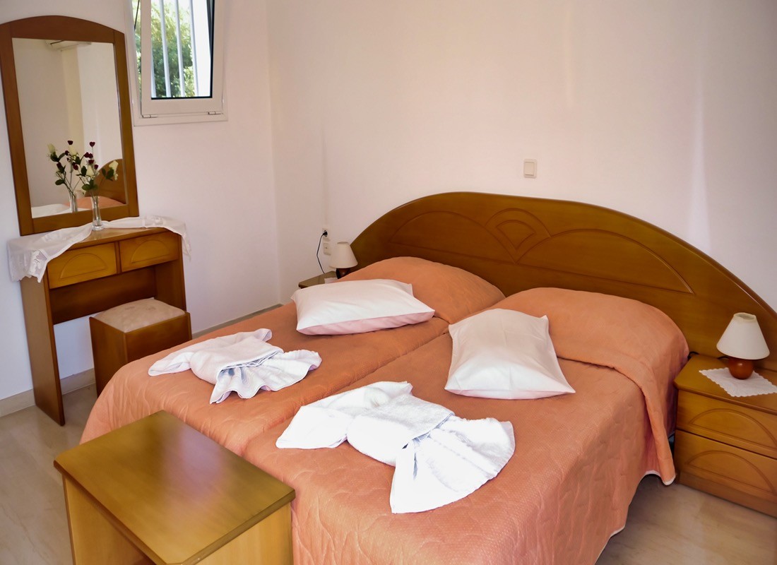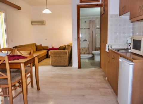 Our Premium One Bedroom Apartment is located on the top floor of the third building, offering beautiful views of the surrounding nature and olive trees. This spacious and modern apartment is situated in a peaceful and private setting, facing the resort's gardens. It features two single beds, a fully-equipped kitchen, and a bathroom with a shower.