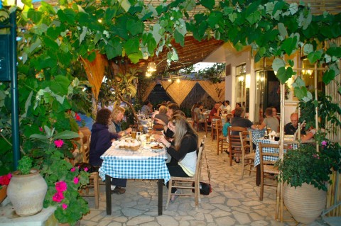 The Brouklis Grill Taverna is a small establishment in the center of Arillas. This restaurant is not located on the sea front but tucked away in a side street, its sign hidden by vines, grown not for the grapes but for the shade they provide.