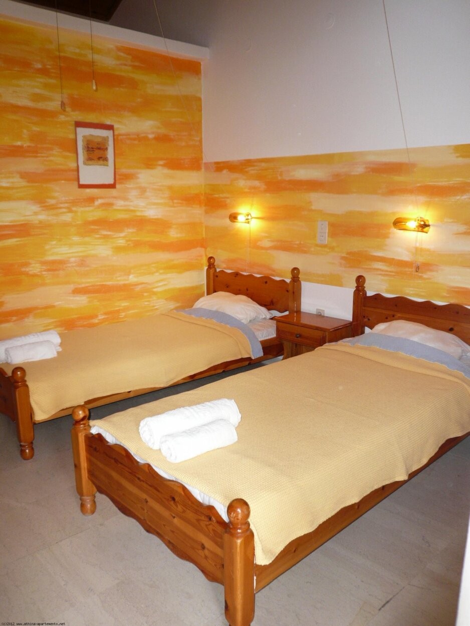 This studio is equipped with two single beds, a wardrobe, a dressing table and a bedside table.