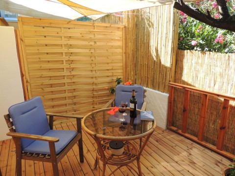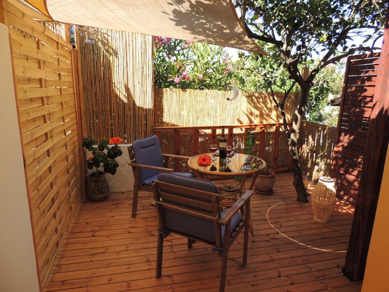 You can sit inside on a small folding table or in front on the balcony and at the rear on the new designed and bigger veranda, which is framed with the neighbour oleander bushes. In summer a sunsail spents shadow.